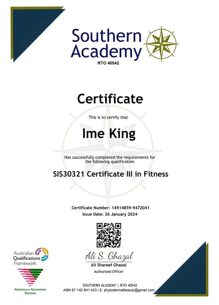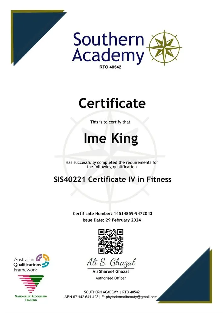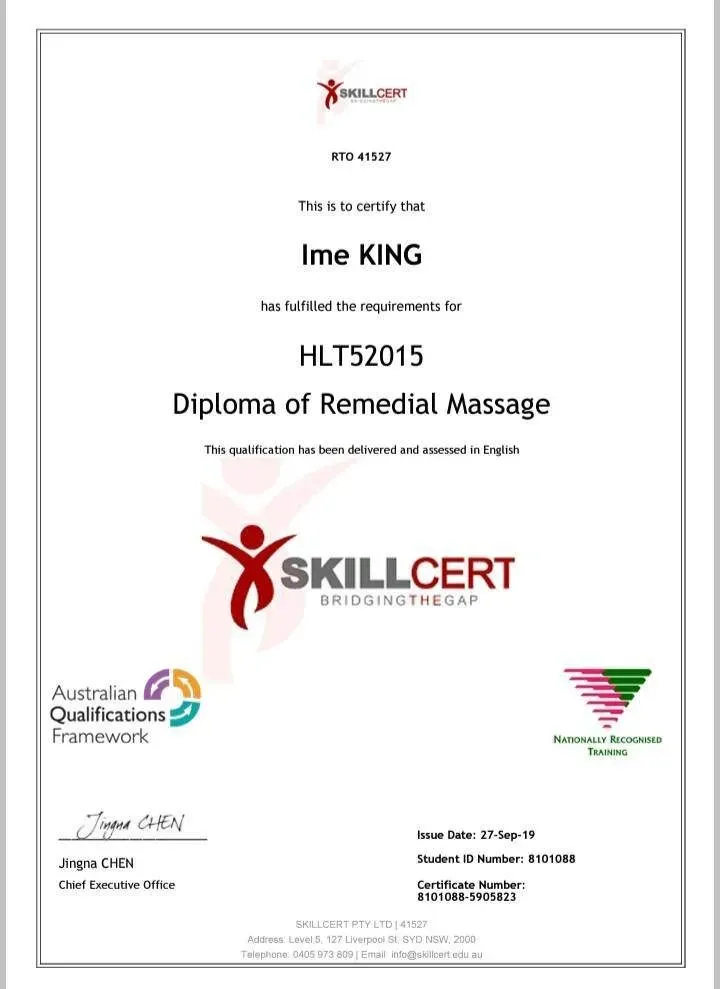 Mr. IME KING has a Australian 1yr Diploma holder in Remedial Massage, Sports Massage, Lymphatic Drainage Massage & 1yr Diploma in Beauty Therapy as a LMP Licensed Massage Practitioner, an Australian Certified Personal trainer & Nutritionist, Australian International Certified life coach and 1.6yr advanced diploma in leadership community development and management